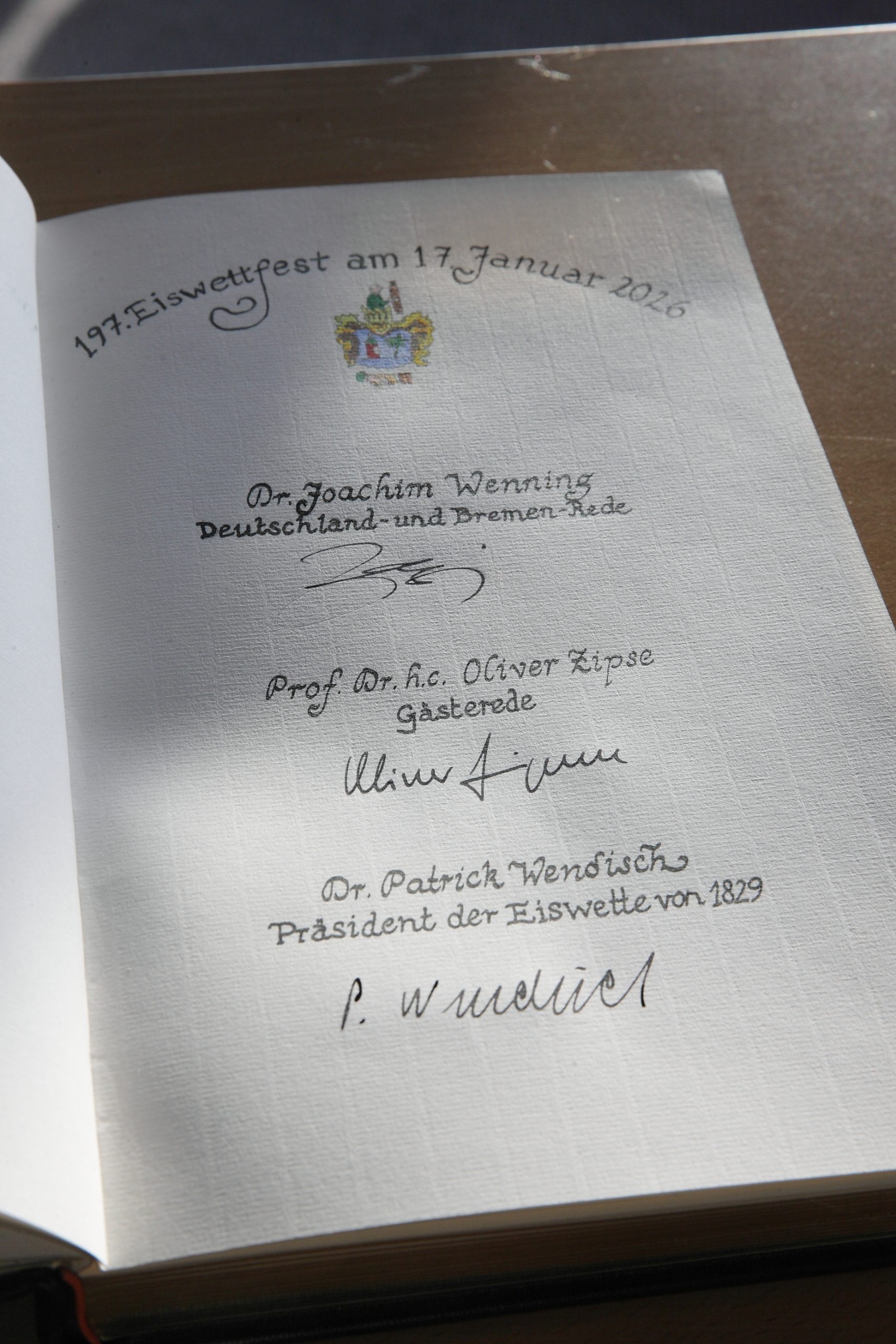 Vor dem Eiswettfest findet der Präsidiums-Empfang statt, zu dem das Präsidium der Eiswette von 1829 die Ehrengäste sowie ausgewählte Gäste auf der Empore im Foyer willkommen heißt. Präsident Dr. Patrick Wendisch begrüßt als Ehrengast Dr. Joachim Wenning, ehemaliger Vorsitzender des Vorstands der Münchener Rückversicherung, der beim Eiswettfest die Deutschland- und Bremen-Rede hält. Ebenfalls als Ehrengast geladen ist Professor Dr. h.c. Oliver Zipse, Vorsitzender des Vorstands der BMW AG, der die Eiswett-Gesellschaft mit einer launigen Gäste-Rede unterhalten wird.
